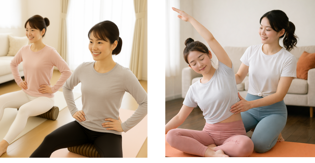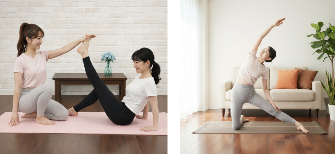 そこで、インストラクター自身が身体が硬いことを活かし、ヨガを敬遠する身体の硬い方目線に立った新常識なレッスンを行っております。ポーズを真似するだけ、身体の硬さを無視し行ったヨガは身体を痛めてしまう危険があり、私も色々と痛めた経験があります。そういったことから、ヨガサロンが決めた一方的なレッスンを提供するのではなく、その時のお客様のお悩みやお身体の状態を丁寧にお伺いし、またお客様の現在の姿勢やお身体の状態、生活習慣も確認させていたただきながら、その方に寄り添ったベストなレッスンを提供いたします。お悩みやお身体の状態によっては、ピラティスの要素も取り入れ、お一人お一人に合ったレッスンをご用意します(インストラクターはピラティスの資格も持ち合わせておりますのでご安心ください)。そのため、レッスンに通うのが苦痛ではなく、身体が良い状態、楽になる変化を実感し、ヨガをすると快適、習慣になるイメージです。一つ一つの積み重ねで身体が変わり、穏やかさと健やかさを兼ね備えた自分を作ることに繋がります。